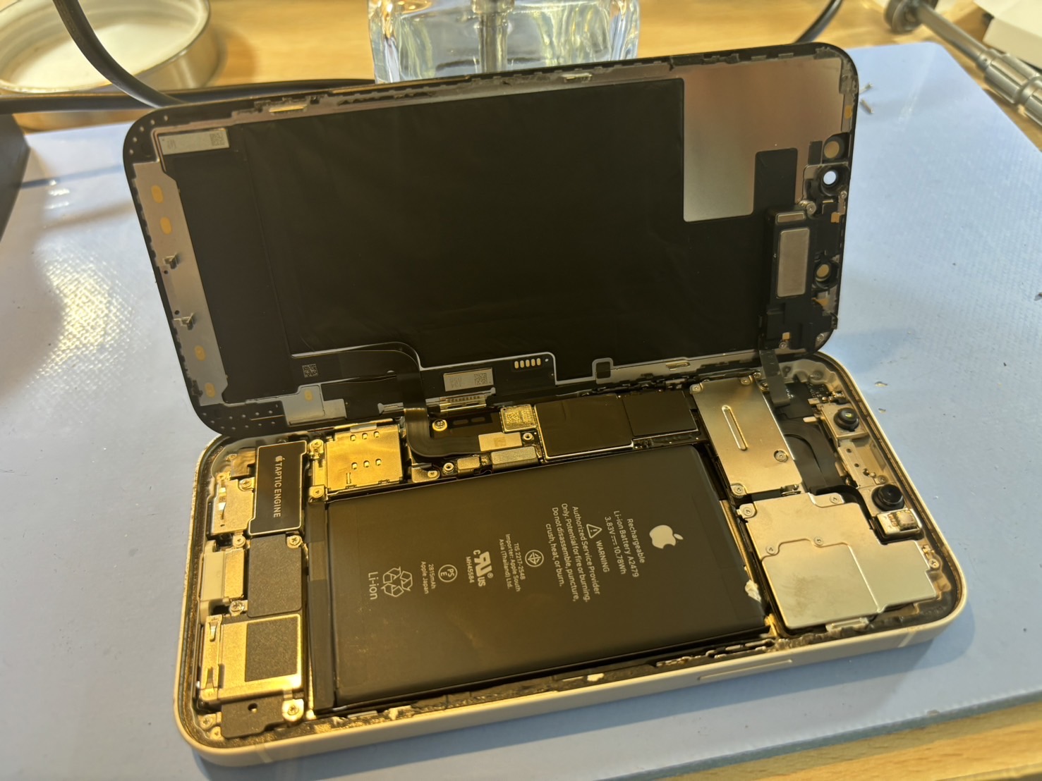 iPhone12の修理を行う際にはまず画面を開けます。縁に強力な糊がついているので熱を加えて温めながら吸盤を使ってゆっくり開けたら、今度はバッテリーを取り出します。